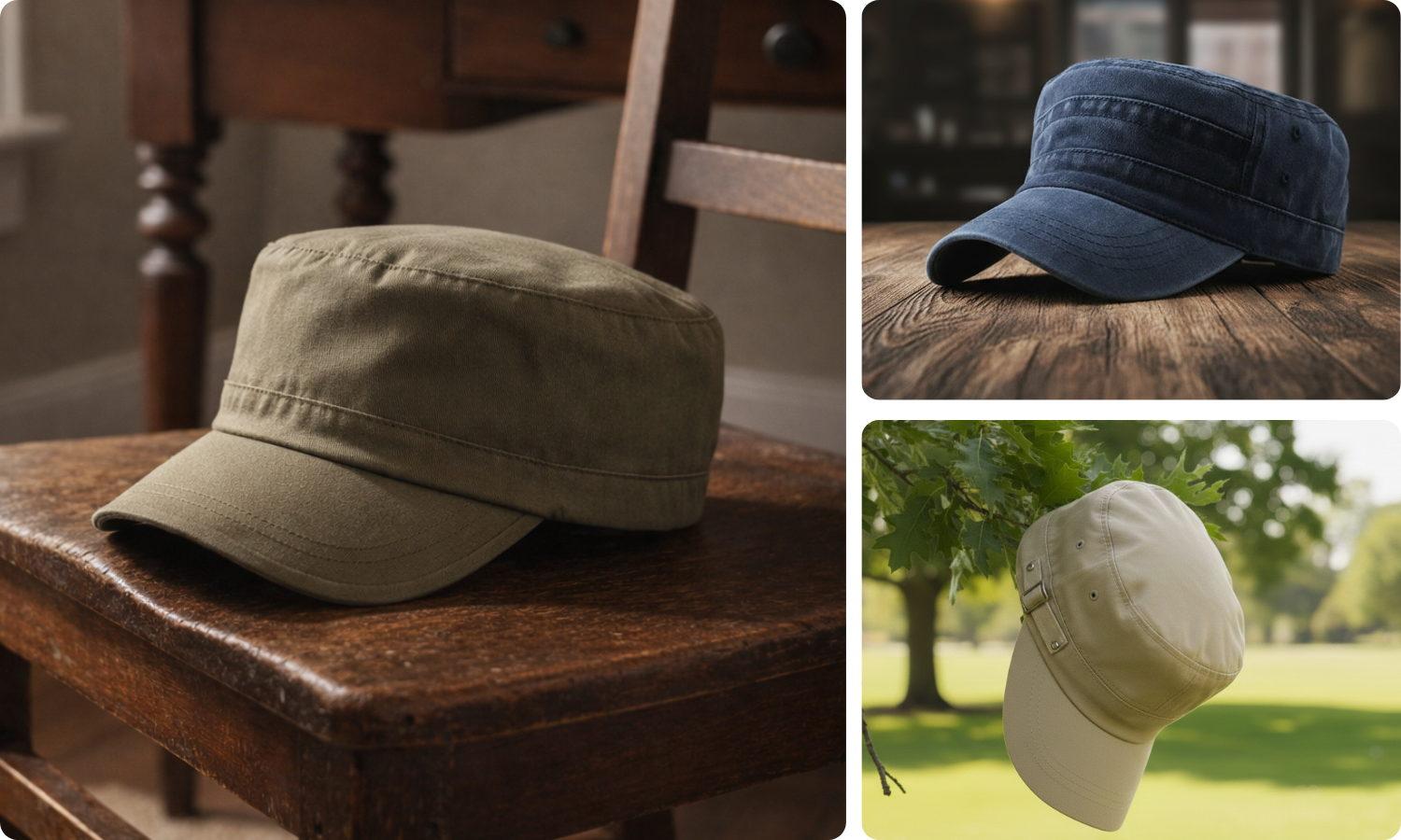 The military cap is appealing because of its flat and structured shape, ideal for a more assertive positioning.